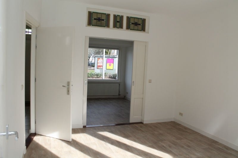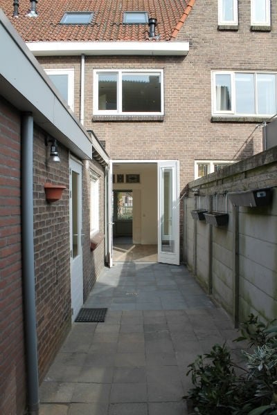 Men komt binnen in de hal welke toegang geeft tot de eetkamer/woonkamer en de trap naar de eerste verdieping. De woonkamer is in twee delen gedeeld en kan gescheiden worden door authentieke schuif paneeldeuren. De eetkamer heeft twee hoge openslaande tuindeuren die naar de op het zuiden gelegen tuin leiden. De tuin is 2 meter breed en 10 meter diep, aan het einde van de tuin beschikt men over een open overkapt schuurtje. De woning heeft een achterom die naar de straat leidt.