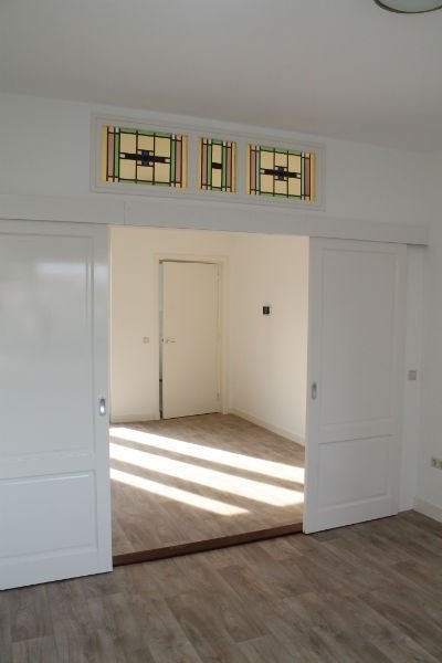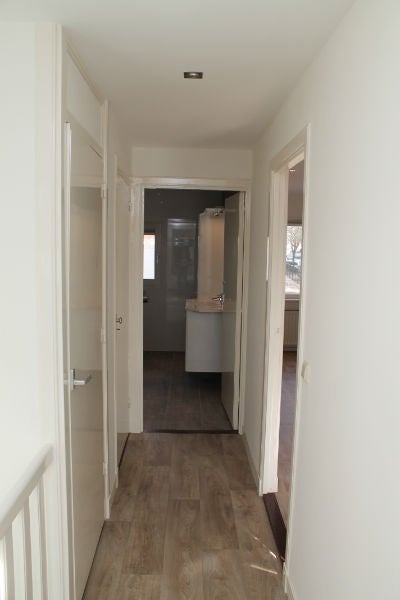 Eerste verdieping; de overloop geeft toegang tot een grote slaapkamer van 20m², in principe is de kamer een doorzonkamer en beschikt daardoor over veel natuurlijk licht, er zijn spotjes in de plafonds verwerkt. Gelegen naast de slaapkamer is de badkamer te vinden, deze is voorzien van een heel mooi badkamermeubel, een inloopdouche en een toilet. Naast de badkamer is ook nog een trappenkast te vinden.