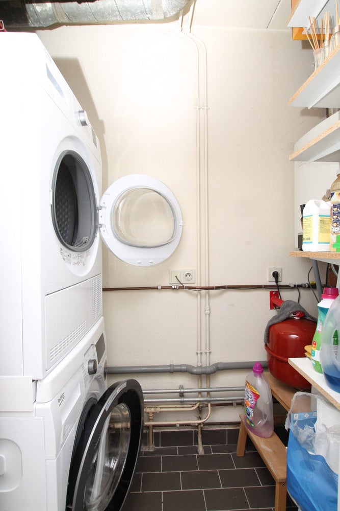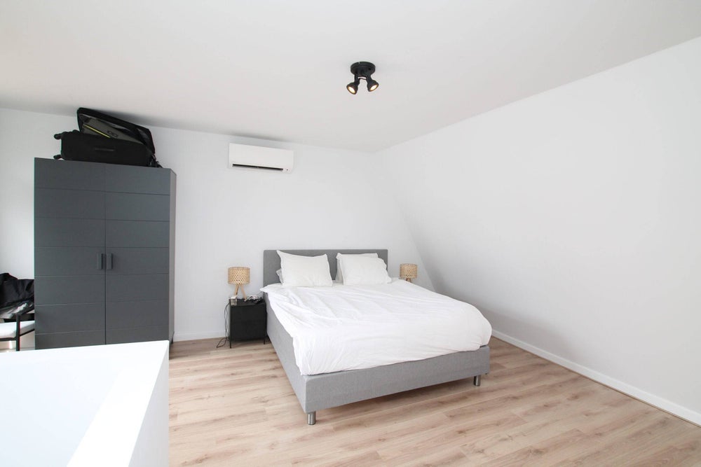 The open staircase in the livingroom leads you to the very large and comfortable bedroom located on the second floor of this apartment. You will find your own bathroom here, equipped with double bassin, a shower and a bubblebath. One can also acces a roof terrace from here although it is not closed off.