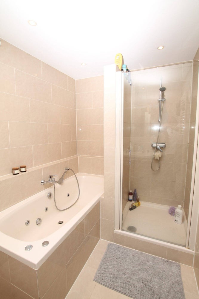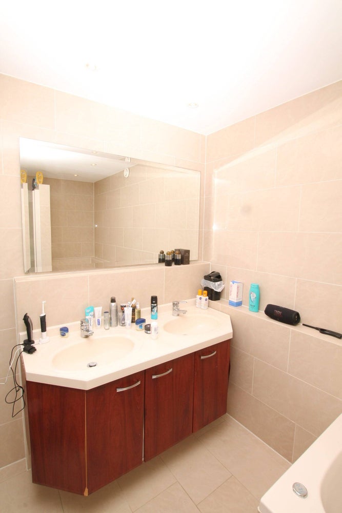 Ligbad, dubbele wastafel, douche, wastafelmeubel