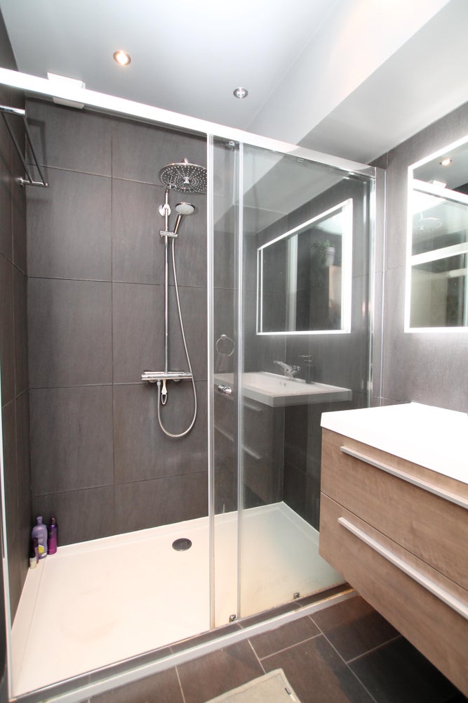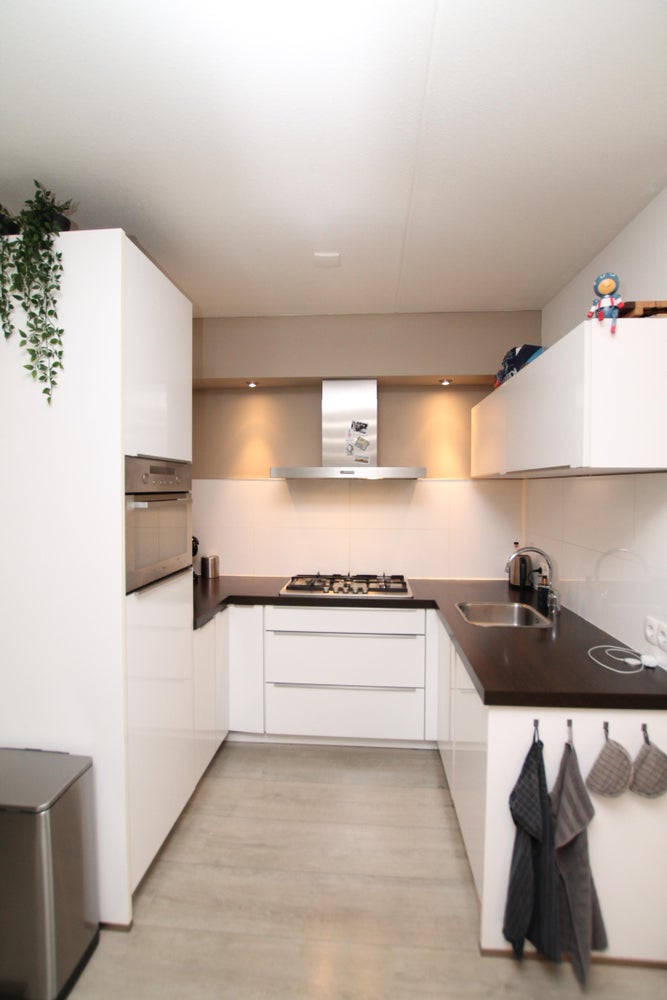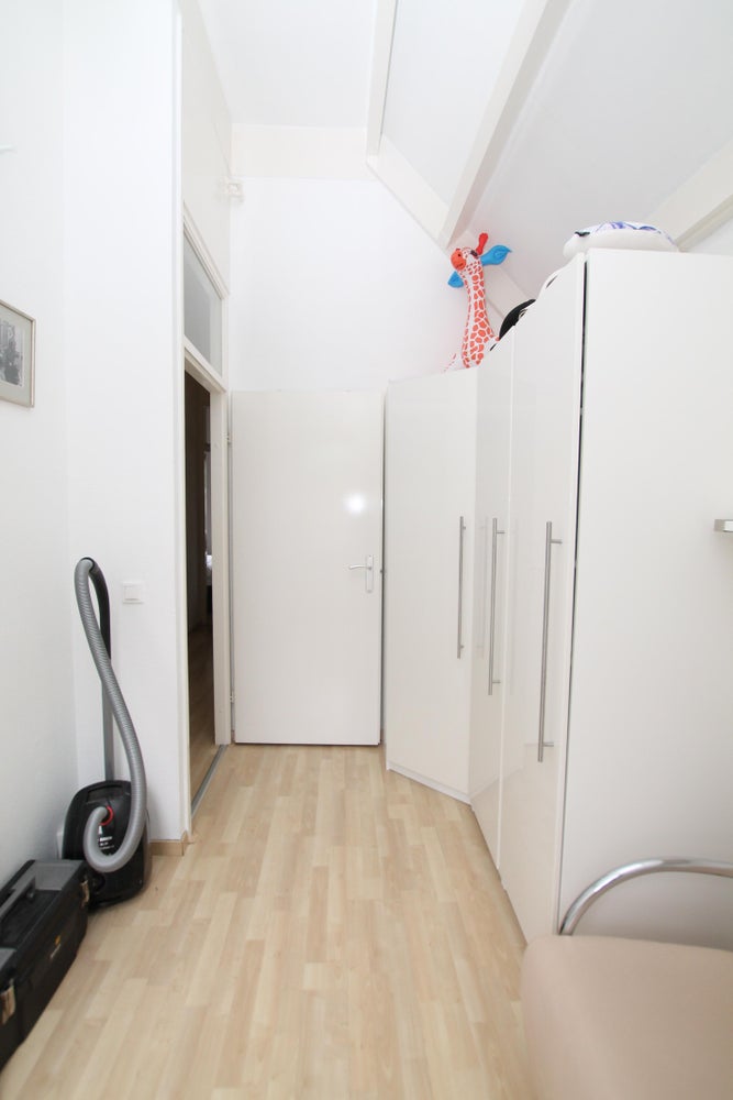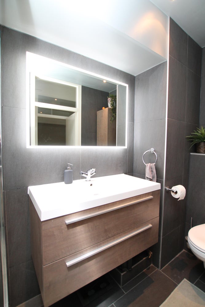 Overloop met toegang tot drie slaapkamers, een badkamer en inpandige berging met opstelling van de cv-installatie, wasmachine en droger. De moderne badkamer is in een donkere kleurstelling uitgevoerd en voorzien van een zeer ruime douche, wastafelmeubel met een verlichte spiegel en toilet. De overloop en de slaapkamers zijn voorzien van een laminaatvloer.